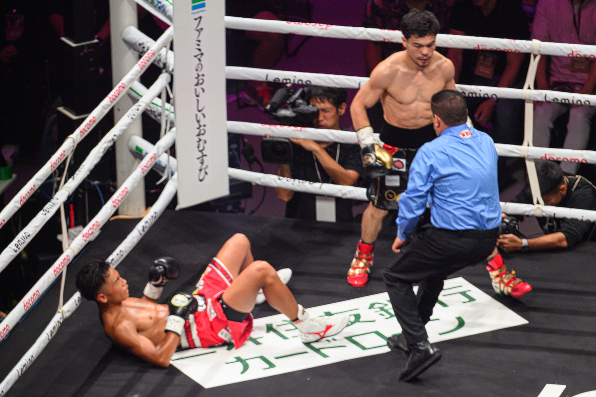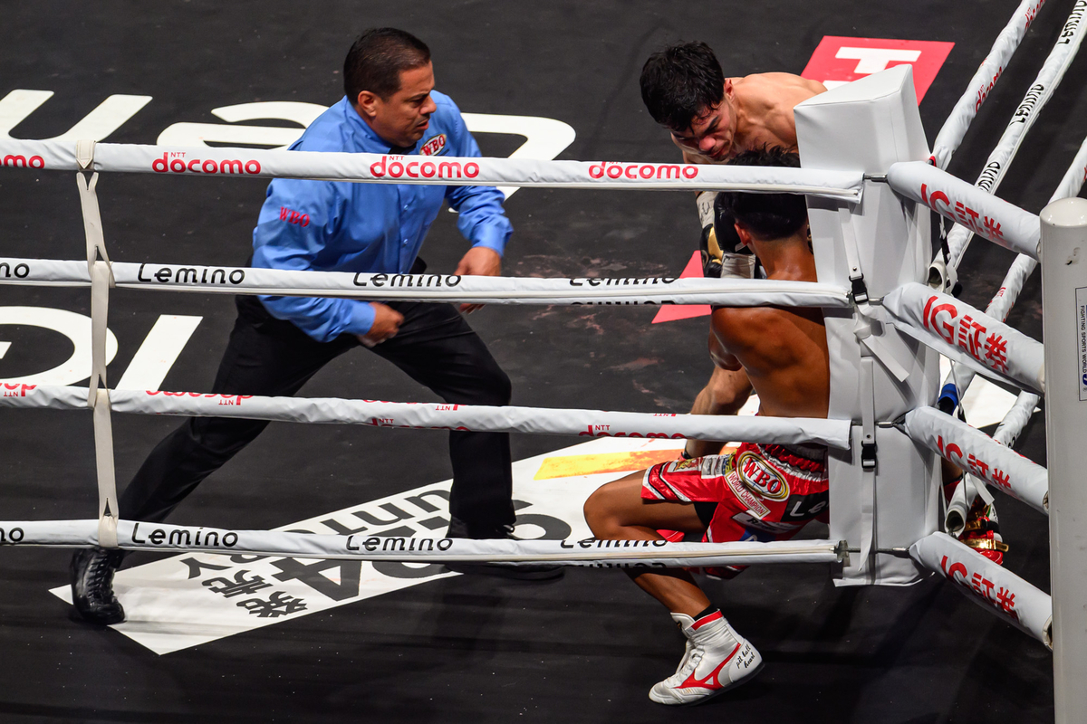 松本流星と高田勇仁のWBAミニマム級タイトルマッチは、5回のバッティングによって高田が深いダメージを負い、試合続行不可能。